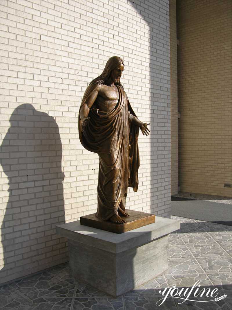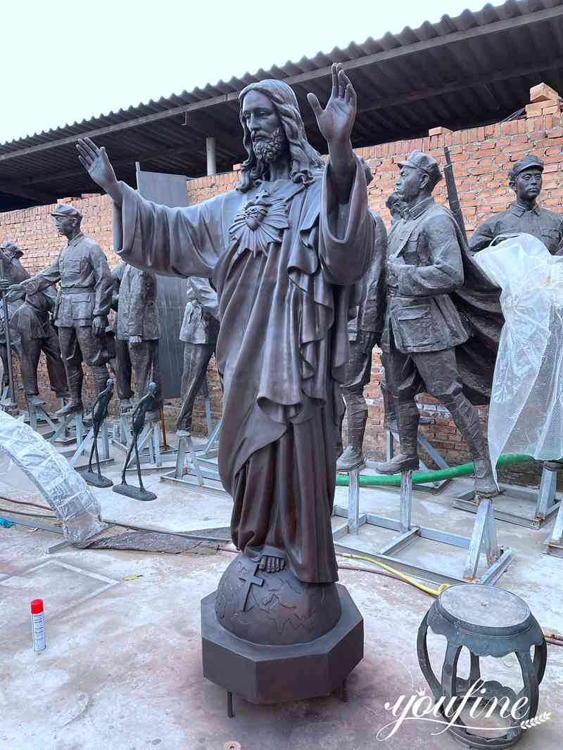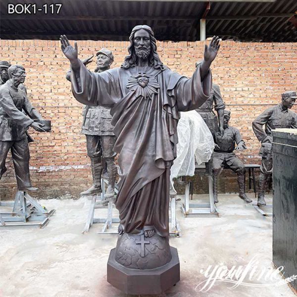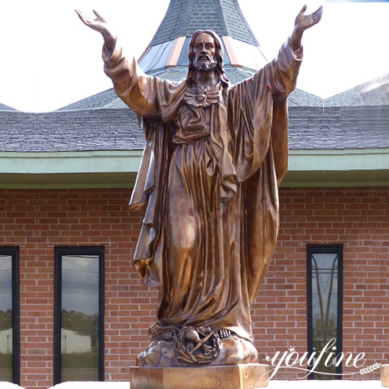 This bronze Jesus statue is life-size and delicately cast each detail by hand. This Jesus is solemn, standing barefoot on a semicircular platform adorned with a symbolic cross. Dressed in Catholic holy garments, he has the Sacred Heart of Jesus on his chest. The Sacred Heart of Jesus, with the heart of Jesus, exposed, with scars and flames on it, expresses Jesus’ great love for the world, and calls on the world to make amends for their sins and love each other. This Jesus sculpture is made of bronze which could last hundreds of years and is perfect for church.