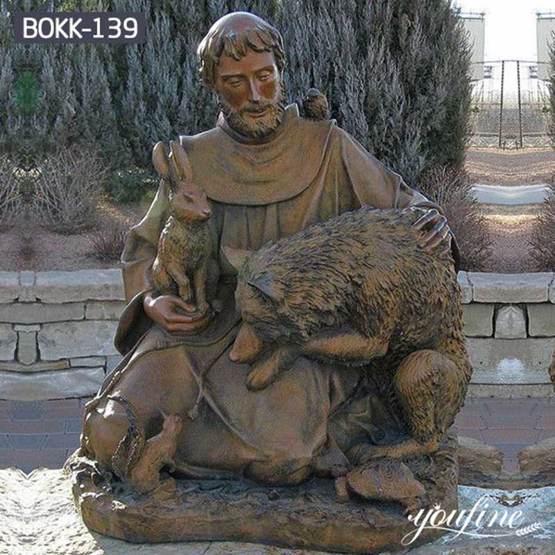This bronze St Francis statue shows a very beautiful picture. St Francis has a cute little rabbit in his arms and an adult wolf is lying beside him. To be honest, it is difficult to see this kind of scene in reality. But as an animal protection messenger, St Francis gets along with the animals so harmoniously.