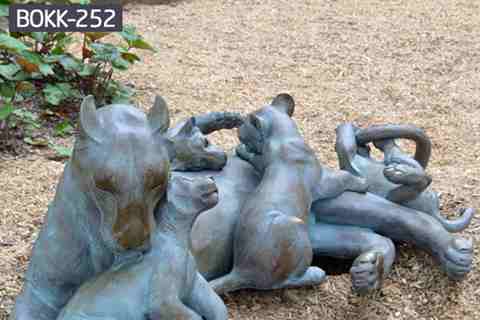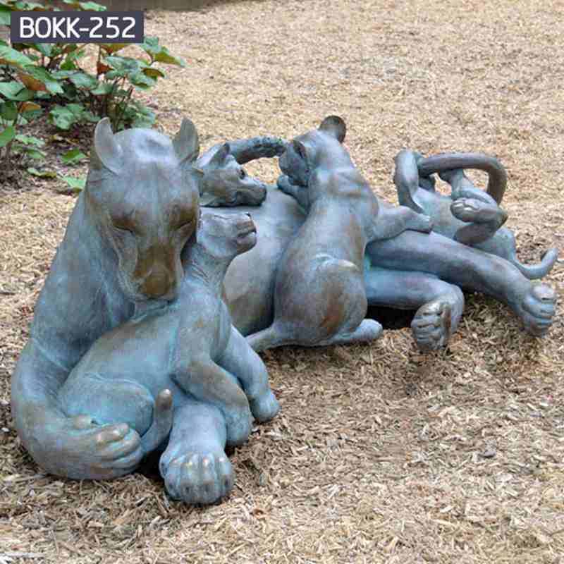 This is a refined bronze casting of a lioness and cubs. The lioness gently cares for her little lions. The little lions snuggled around the lioness. What a happy lion family! This warm picture highlights the greatness of maternal love. The Bronze Wild Lion Family Sculpture contains a lioness and four little lions. They may be waiting for the lion to feed back. This is a perfect lion family.