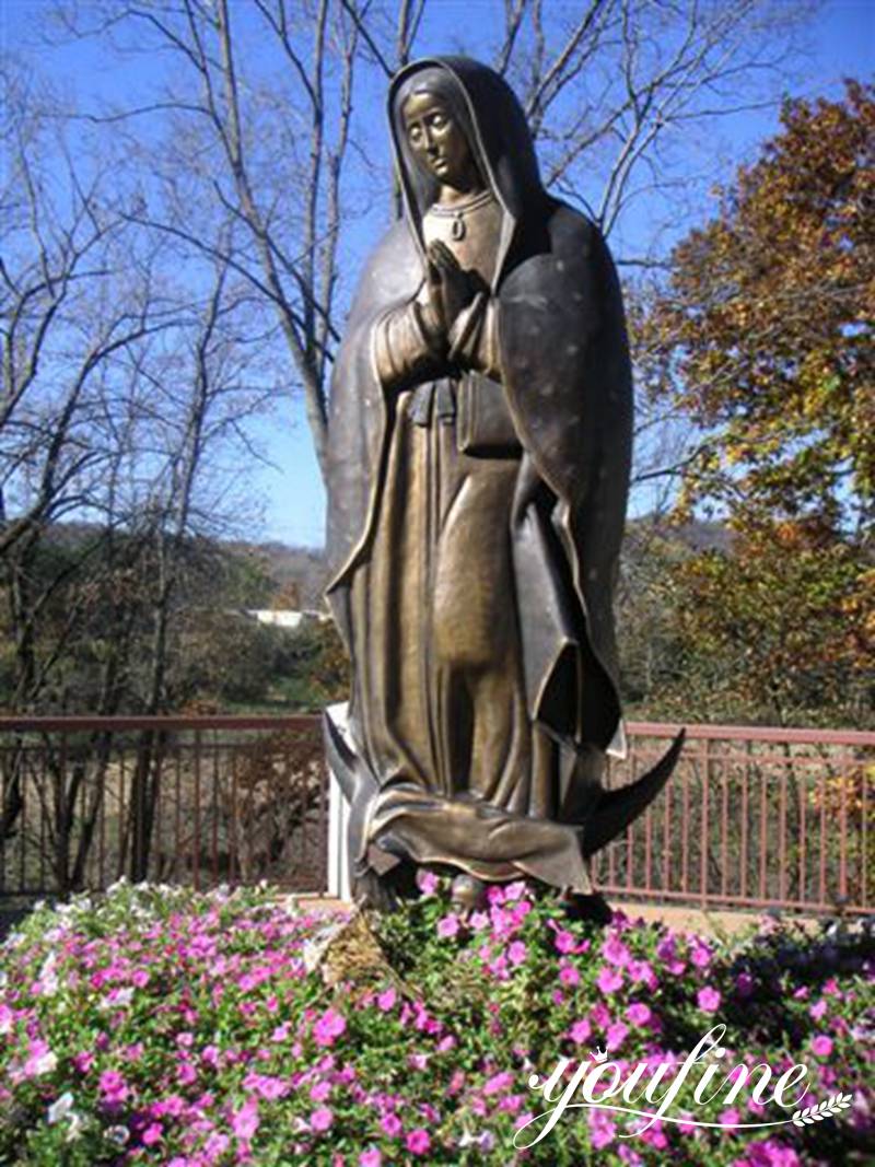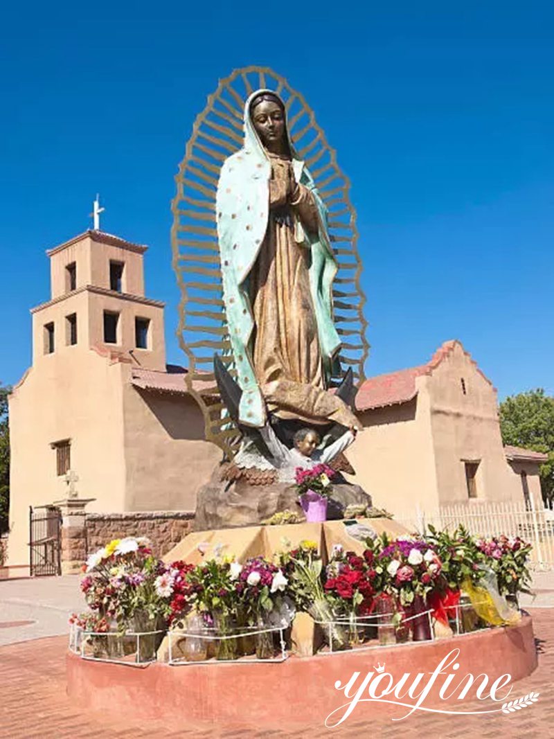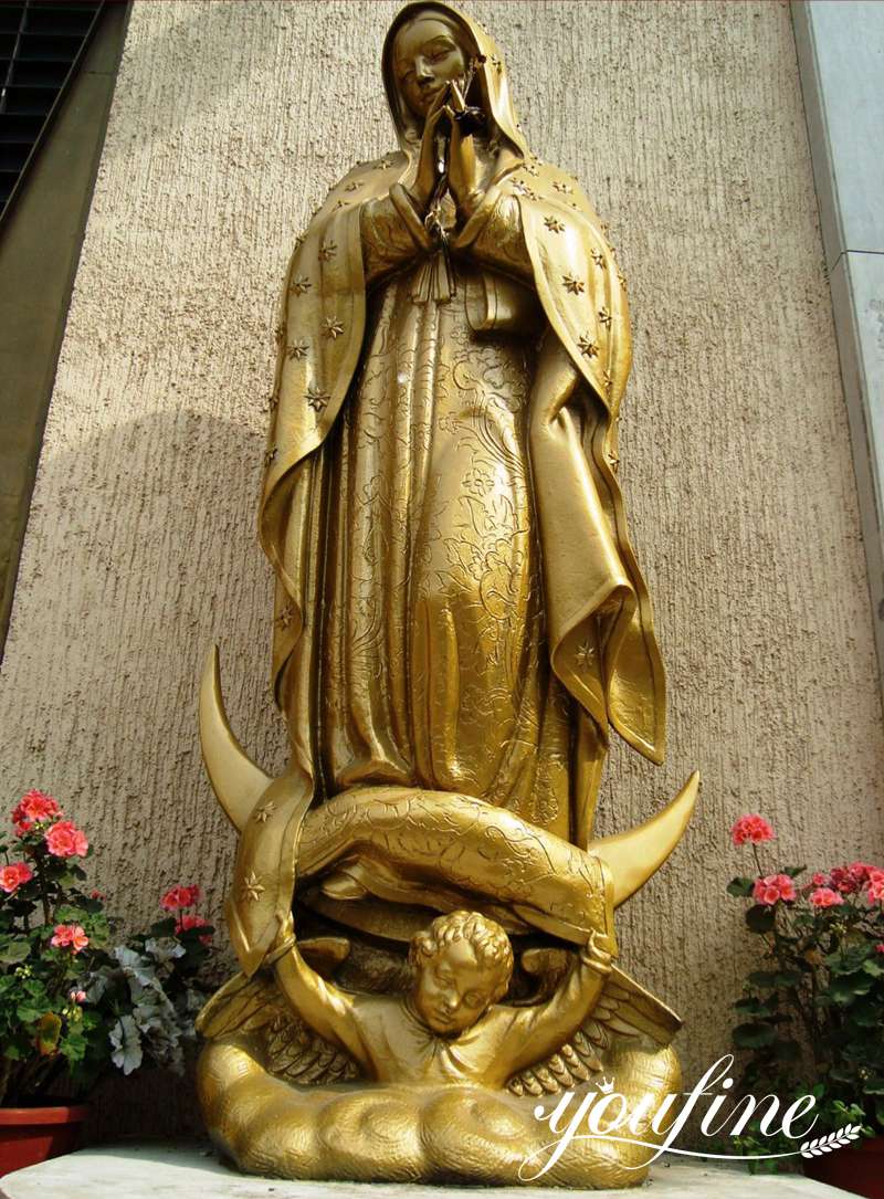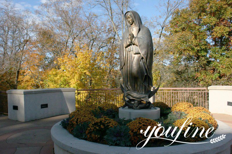 This is a carefully cast bronze statue of Our Lady of Guadalupe for sale, and we could clearly see that the Madonna is cast in a lifelike manner. The outdoor Guadalupe statue sculpture has an amiable facial proportion and looks very peaceful and calm. The Virgin is praying calmly with her hands folded and her eyes closed. The YouFine artists carefully cast the details and light behind her on all sides. This is an absolutely captivating outdoor decorative bronze statue
