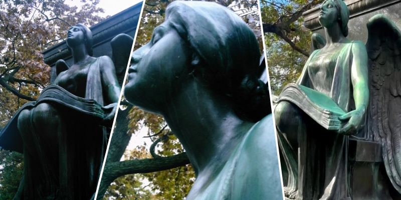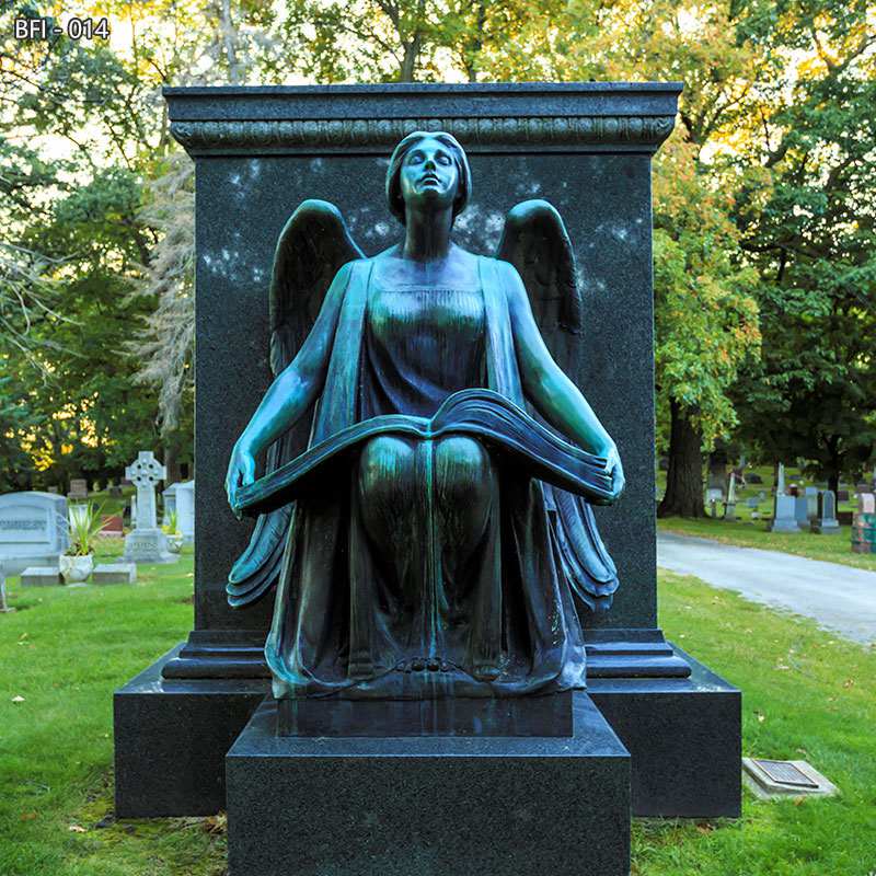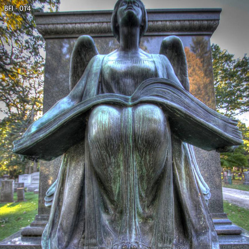Bronze angel statues for sale depict an angelic female figure with outstretched wings, seated in a sad or contemplative pose, with an open book or tome in her lap. The angel’s calm facial expression and downcast gaze convey a sense of sadness, mourning, or reflection, appropriate for a cemetery monument commemorating the deceased.