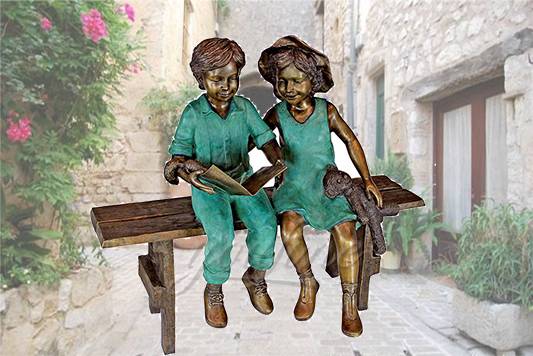 Life size outdoor sitting bronze children reading sculpture