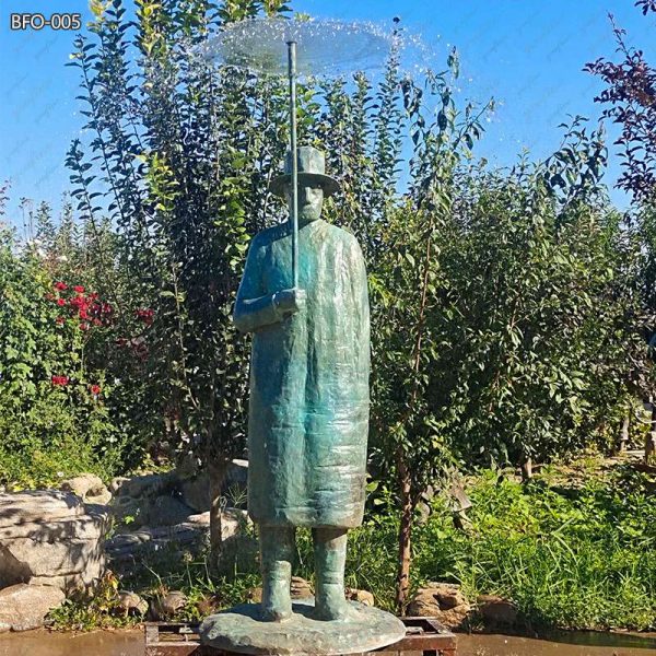 This bronze statue fountain has a modern abstract design concept. The artist cleverly designed the water flow of the fountain into an open umbrella. The overall image shows a man holding an umbrella standing there. It is suitable for decorating gardens, courtyards, squares, villas, manors and other places, bringing a modern atmosphere to the environment.