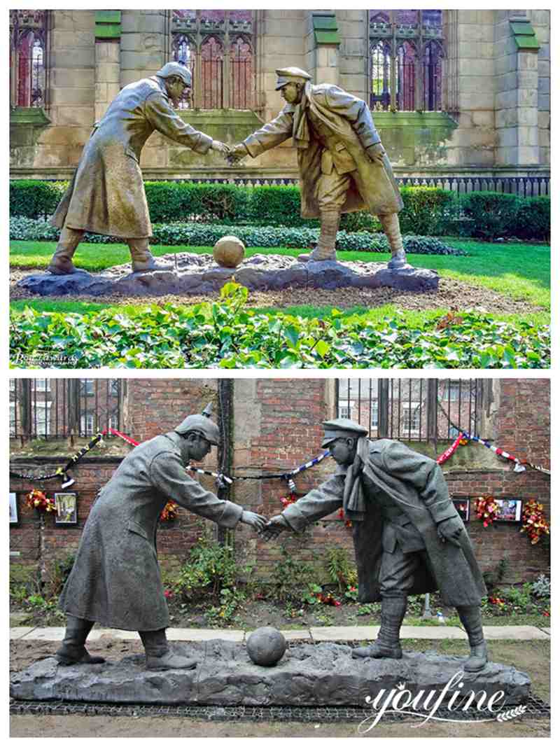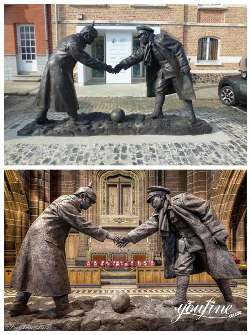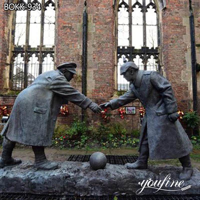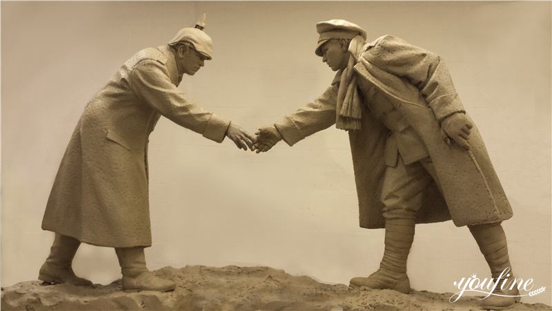 Soldiers are the vanguard of protecting the country. YouFine factory has been casting bronze soldier statues for 39 years. Therefore, we pay great attention to expressing the connotation of sculpture. Our Christmas Truce statue depicts soldiers from two camps shaking hands, and there is a football between them. Obviously, this famous moment is called Christmas Truce.